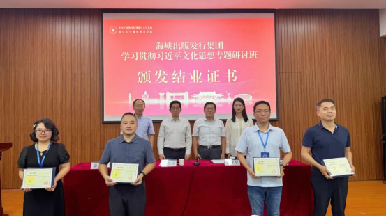 9月22日至26日,海峽出版發行集團學習貫徹習近平文化思想專題研討班在浙江大學舉辦。集團黨委書記、董事長黃葦洲出席結業式并作總結講話,集團黨委副書記、總經理嚴桂忠出席開班式并作動員講話。集團領導謝興權、陳愛民、陳遠,所屬單位和總部部門比照處級管理干部共57人參加學習培訓。