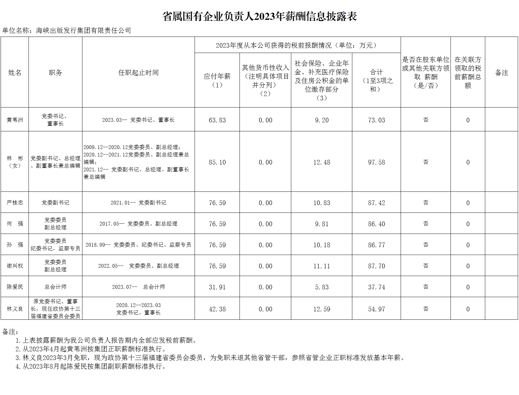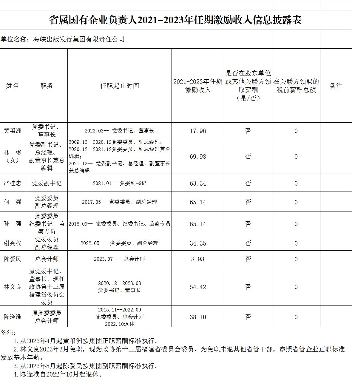 海峽出版發行集團省屬國有企業負責人2023年度薪酬披露表及2021-2023年任期激勵收入信息披露表